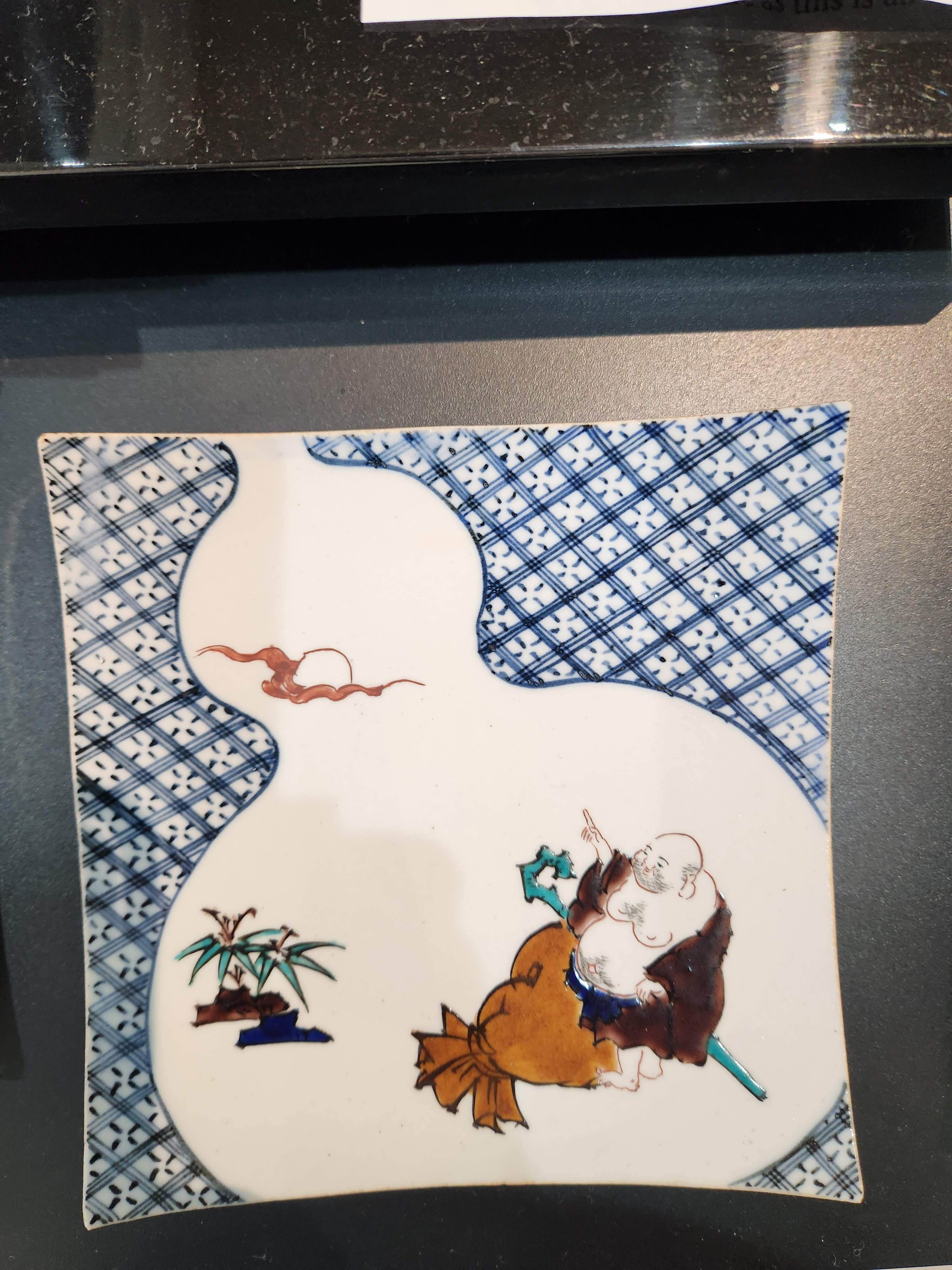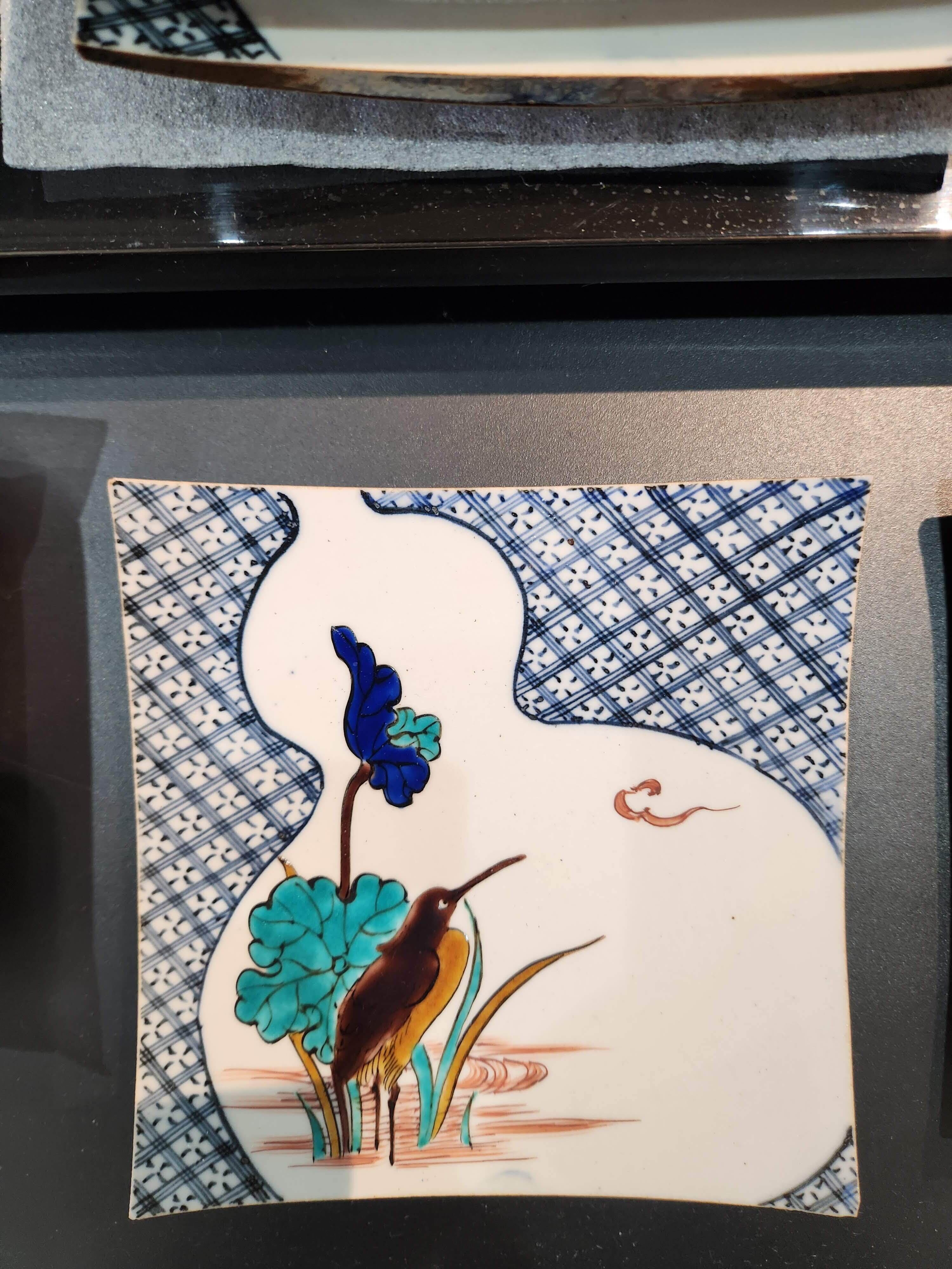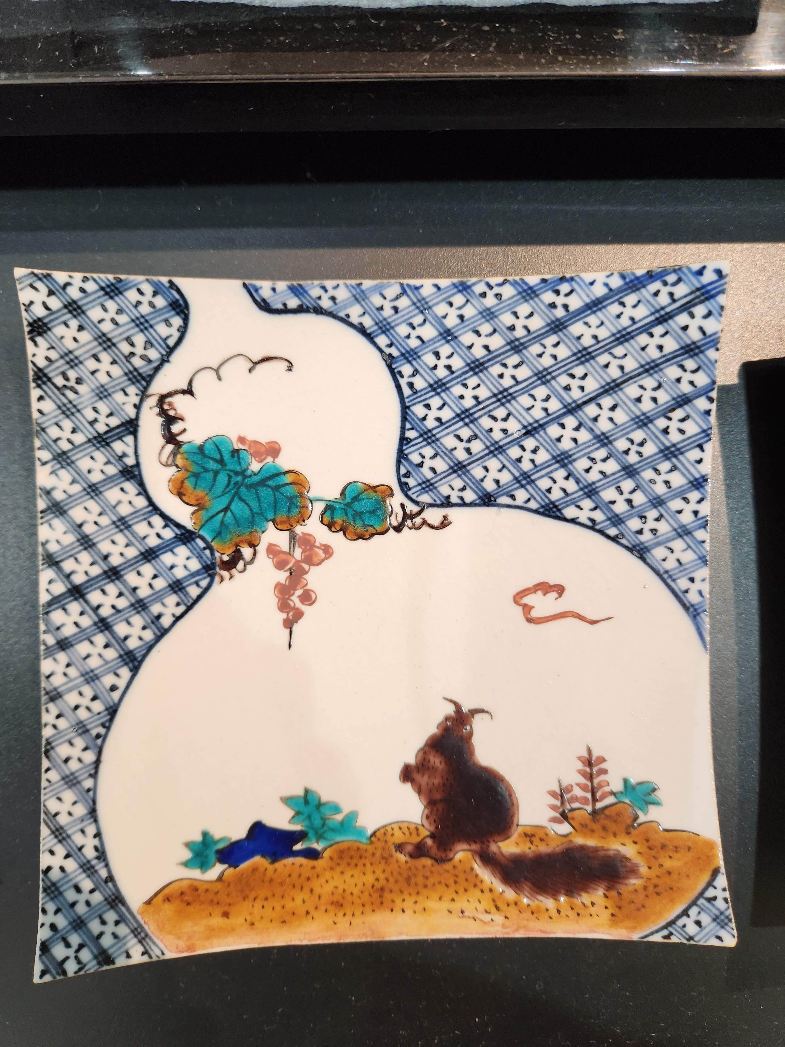 角皿に緻密な地模描き描き、ひさご型の白抜きの中に九谷の伝統柄が丁寧に描かれている、しゃれた逸品です。